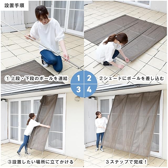 【本体仕様】本体サイズ:幅200×高さ240cm/本体重量:2.2kg/内容:シェード本体 1枚、ポール(上段/下段)各4本、固定用ヒモ3m×2本/ハトメ(錆びない樹脂製):4カ所/材質:ポリエチレン
