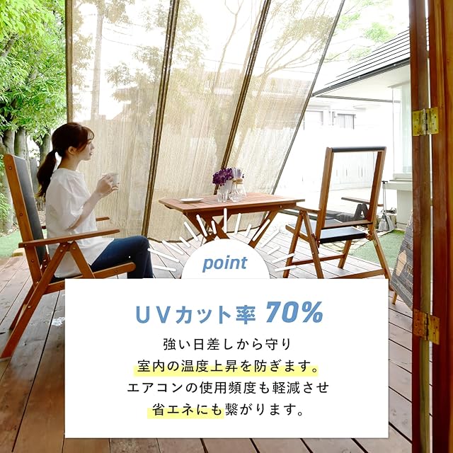 【特徴】日差しを和らげ通気性にも優れた洋風のたてすです。カラーはブラウンです。外からの日差しを和らげ、内側からは見通しがよく開放感があります。自然の風を取り入れ、エアコンの使用も抑えられるエコなアイテムで、UVカット率も約70%と高いので肌の日焼けや家具や床の劣化も防ぐ事ができます。横幅が2mあるので窓全体を覆い隠すことが可能です。またインテリア性もバツグンで、工事不要で簡単に取り付けることができます。