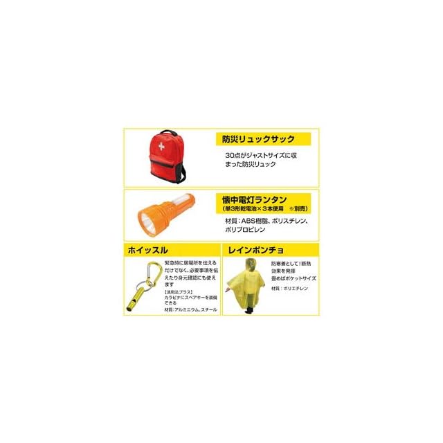 防災セット30点入り<br>災害時に必要なものを取りまとめた 避難リュックセット。 安全な場所に逃げるために必要なものを30点揃えました。<br>すでに準備している物と重複しないように、もしくは重複しても困らないような商品(消耗品など)を中心に選定した無駄のないセットを作ろう!という考えの元、作られたセットです。<br>まずは生きる!一次避難対策に絞った商品群なので、その分、軽量化・低価格化に成功しました。<br>低価格になった事により、防災バッグが身近な物になり、お手軽に一人に1袋持つことが出来ます。