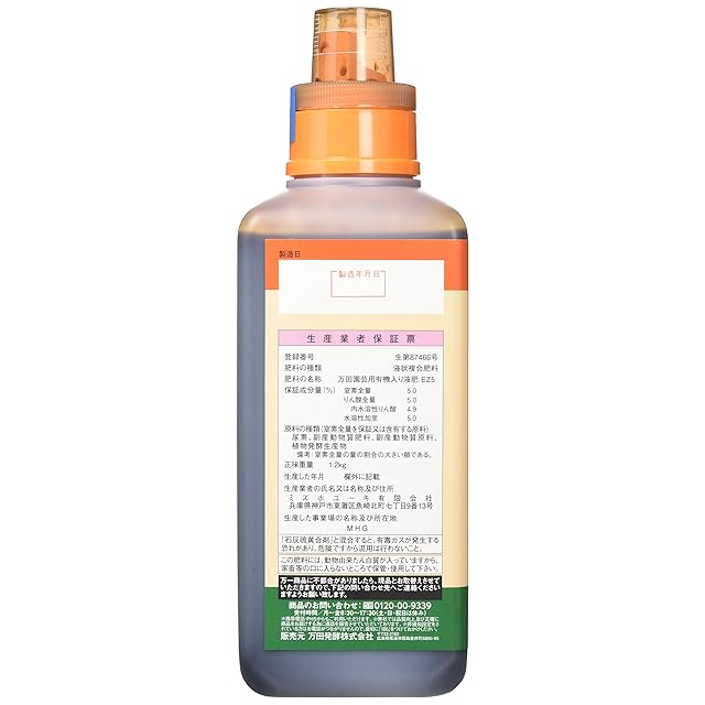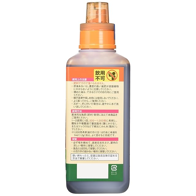 使用方法:1~2週間に1回、500~1000倍に薄める(水2リットルのバケツに添付の専用キャップ2mlが目安)