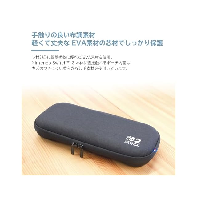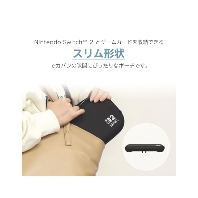 Nintendo Switch 2 とゲームカードを収納できるスリム形状でカバンの隙間にぴったりなポーチです。