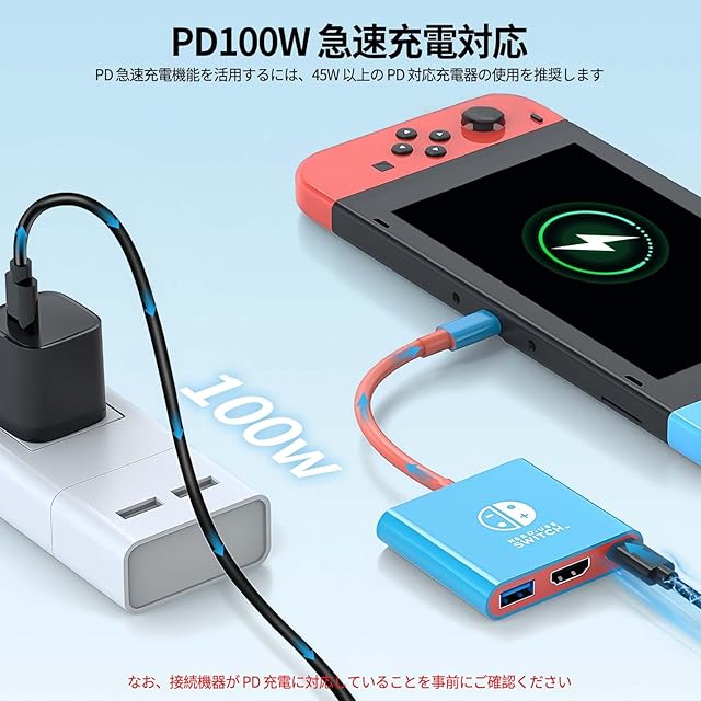 ⚡【PD100W 急速充電対応】この HDMI 変換アダプタの PD 充電ポートは最大 100W まで対応し、Switch用本体、スマートフォン、タブレットなどを素早く充電可能です。外出先での長時間ゲームや作業も安心、充電切れを心配せずに過ごせます。PD 急速充電機能を最大限に活用するには、45W 以上の PD 対応充電器の使用を推奨します。なお、接続機器が PD 充電に対応していることを事前にご確認ください。