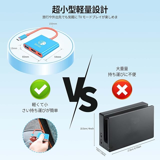 【超小型軽量設計】サイズわずか 60×54×13mm、重量たったの 36g とコンパクト。収納バッグに簡単収納でき、旅行や外出先でも気軽に TV モードプレイが楽しめます。赤 × 青のクラシックカラーを採用し、デザイン性も兼ね備えた多功能拡張坞です。純正品同等の高性能を発揮し、Switch用や各種デバイスに最適な接続ソリューションを提供します。