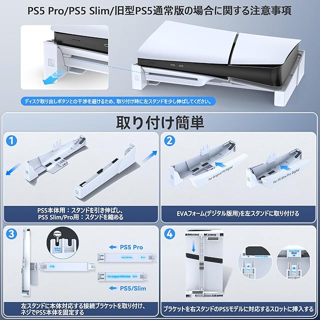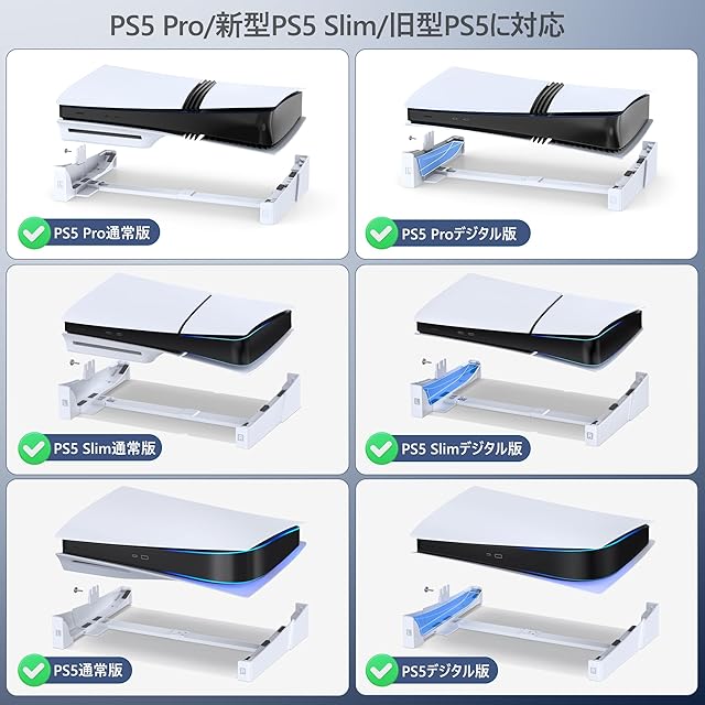 【PS5/PS5 Slim/PS5 Pro対応】PS5横置きスタンドは旧型PS5/新型PS5 Slim/PS5 Pro通常版とデジタル版に対応できます。※PS5デジタル版を取り付ける前に、EVAフォームパッドをスタンドに取り付ける必要があります。