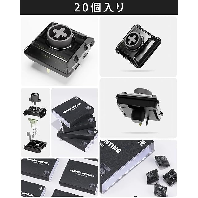 「パッケージ内容」綺麗なケースに入った Shadow Hunting ロープロファイル キースイッチが20個入りです。