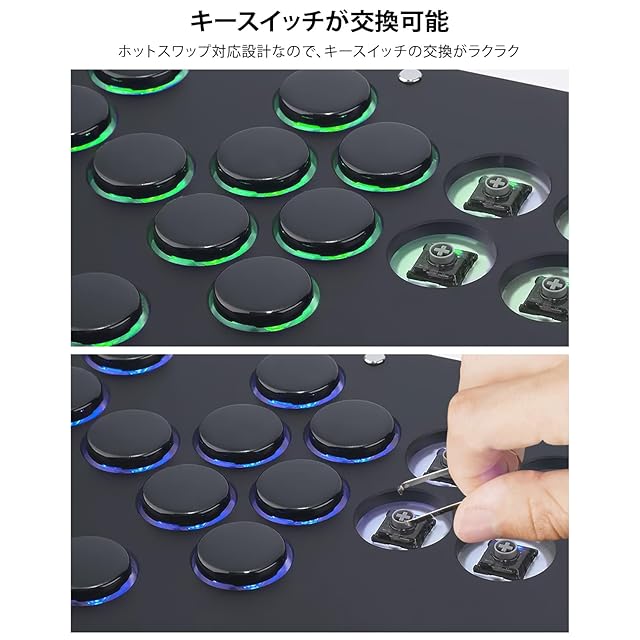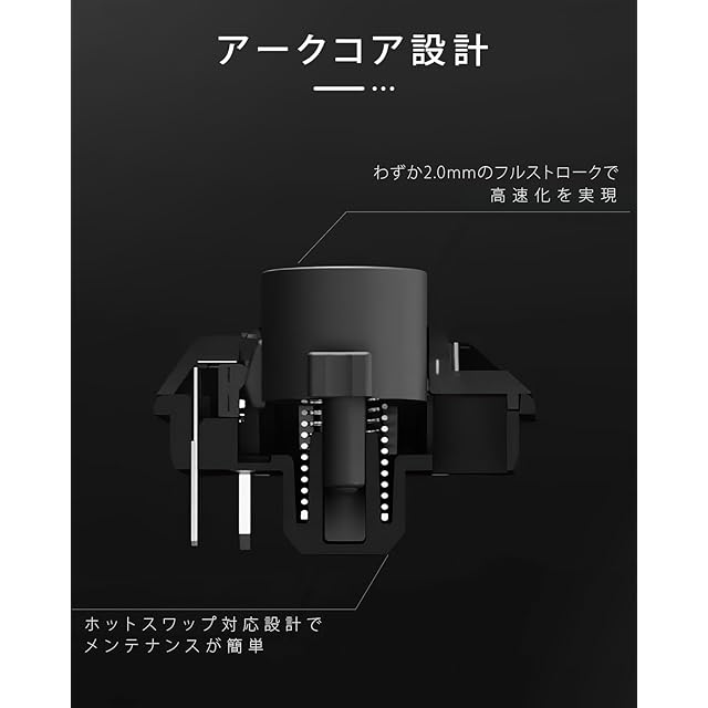 「クリスタル ロープロファイル キースイッチ」 ホットスワップ対応で、弊店のレバーレスアケコンの本体への取り外しが不要、易くスイッチを交換してカスタマイズ可能なので、スイッチの摩耗を気にしなくてもいい、押す体感で35g程度、指の疲れもなく、様々な打鍵感を体験できます。