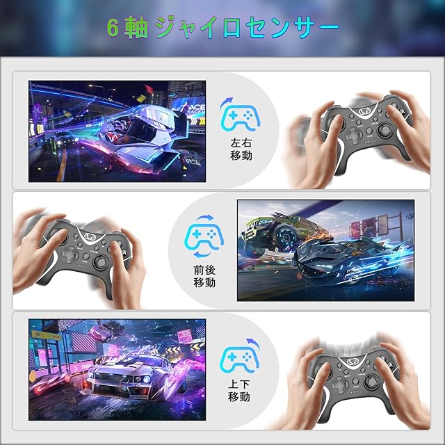 【マクロ編集機能&6軸ジャイロセンサー搭載】2つの背面ボタン(MLとMR)が搭載され、マクロボタンと同時に押して、プログラミングモードに入ります。マクロボタンは各機能ボタン(A/B/X/Y/L1/L2/R1/R2上/下/左/右ボタン)とマッピングでき、一つのプログラムに最大16個コマンド入力可能。一連のキー操作をひとつのボタンに割り当てることで、ゲーム中によく使う複数の連続する操作や必殺技などの登録には便利です。純正プロコンと同等の高感度6軸ジャイロセンサーが搭載され、ゲームのプレイ中視点移動や傾け操作などが簡単に実現できます。※一部のゲームでジャイロセンサーが反応しない場合は、ゲーム内でまたは本体設定で補正することを試してください。