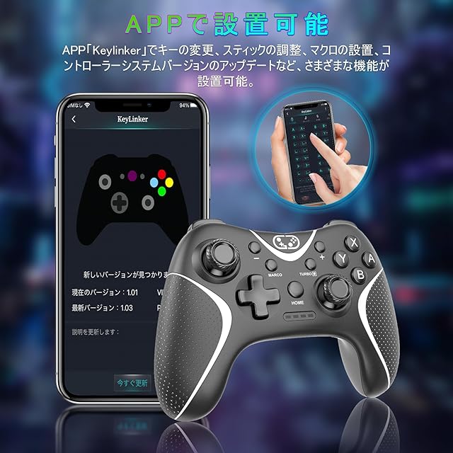 【APP対応&パッケージ内容】人間工学に基づいたデザイン、長時間持ち続けても疲れにくいです。グリップの表面はABS軽量材料で、表面滑り止め加工を施しており、手触りが心地よくて、しっかりと握ることができ、ゲーム中手汗などで滑る心配いりません、存分にゲームを楽しむことができます。こだわりの細部デザイン、ボタンの精度を高め、耐用性もさらにアップさせる。さらに、APP Keylinkerでコントローラーの初期化、連射の設定、キーテスト、ボタンの割り当て、スティックのデッドゾーンの調整、振動強度の調節、マクロプログラミング、ジャイロセンサーの補正など様々な機能の設定や調整ができます。パッケージ内容:コントローラー本体×1、充電ケーブル×1、日本語取扱説明書×1。※ご購入後に不具合や初期不良などの場合は、是非お気軽に販売元に連絡して下さい。