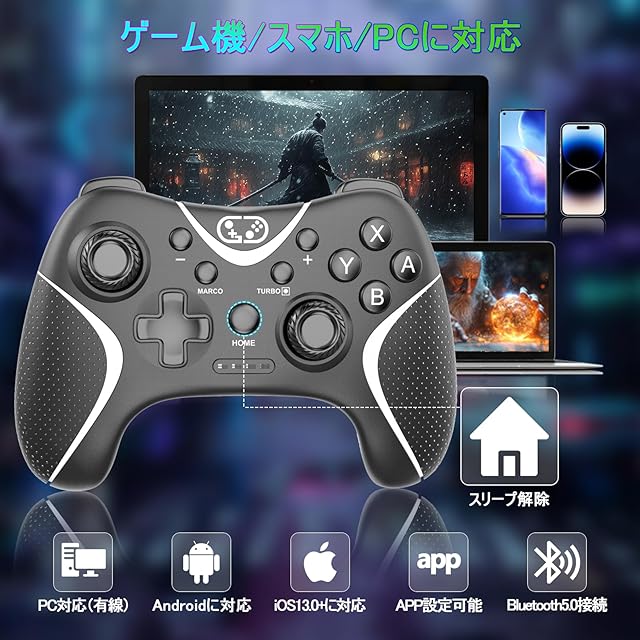 【2024年アップグレード版&高い交換性】本製品は2024年アップグレード版Switch用ワイヤレスコントローラーです。自動連射(連射ホールド)機能、2つの背面ボタン搭載、3段階Turbo連射速度、4段階HD振動、Bluetooth5.0接続、6軸ジャイロセンサー、マクロ機能など、純正プロコンにも搭載されていない多機能が搭載されます。さらに、本コントローラーは高い汎用性を持つ、Switch/Switch Lite/Switch有機ELモデルに対応、Android/iOS13.0+/ Windows7+に対応可能。Switch本体以外にも、パソコンやスマホ、タブレットなどの端末に接続可能です。Switchゲームにすべて対応でき、MFI認証のスマートフォンゲームにも対応可能、この一台で思い存分ゲーム三昧!