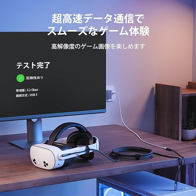 【5Gbps 高速リンクケーブル】このUSB3.2 Gen1 (USB3.0) ケーブルは、5Gbpsのデータ転送速度をサポートしています。Questに接続すると、帯域幅は2.5~3.2Gbpsに達し(コンピューターの性能によります)、PCがサポートする最高のディスプレイ解像度とリフレッシュレートを体験できます。ゲームアドベンチャーでは、高いグラフィック忠実度と鮮明なビジュアルをお楽しみいただけます