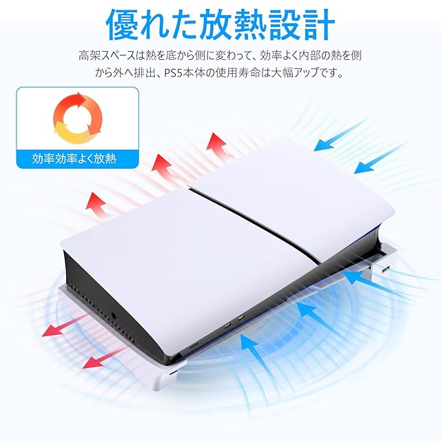 【放熱改善】PS5 Silmを横に置きして、放熱穴は底から側に変わって、下に隙間空くんで空冷感がまして、放熱穴は底から側に変わって、熱がこもりにくく、効率よく内部の熱を側から外へ排出、本体の使用寿命は大幅アップします。