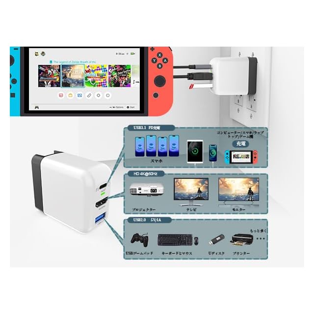 【高速充電と機能拡張】3つのインターフェースを 1つのデバイスにまとめ、Switchドック高速充電(*Switch 2対応不能)と機能拡張を実現しています。USB-C PDインターフェースは最大31Wを出力し、USB-Aインターフェースは転送速度480Mbpsのデータ通信をサポートします。HDMI インターフェースは HDMI2.0 4K@60Hz ビデオ出力が可能です。
