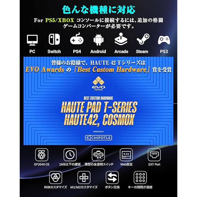 【ご注意&超低1ms遅延】 For PS4/PS5本体の接続については、公式サイトまたはマニュアルを参照して設定する必要がありますので、必ず日本語取扱説明書または公式サイトのリンク先(haute42.com/supports/)をよくお読みください。本製品はPS5本体でPS4ゲームをサポートしていますが、PS5やXBOXに接続する際は、専用の格ゲーコンバーターが必要です、互換性を確保するために、ぜひ別途にご購入ください。弊社では、PS4/PS5に対応したBooter5コンバーターと、XBOX用のBrook Wingman FGCを取り扱っています。ボタンはホットスワップ対応、本体の開閉が不要で、易くスイッチやキーキャップをカスタマイズ可能なので、スイッチの摩耗を気にしなくていいです。万が一、キーキャップが取れるや自然磨耗の場合は弊店までご連絡下さい、キーキャップの交換を無料で手配させていただきます。