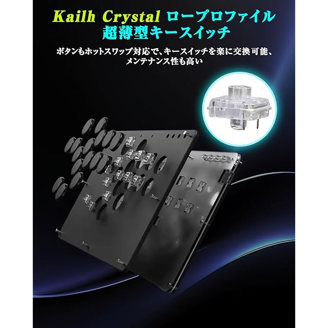 【ボタン交換が可能& RGB カスタマイズ】ボタンは静音強めのKailh クリスタル 薄型スイッチを使用、押し心地が絶秒!発光パターンは4種類、配色は概ね好きな色に設定でき、ボタンを押した時だけ別の色に光らせることも可能です。なお、ボタンはホットスワップに対応しているため、本体の開閉が不要、易くスイッチやキーキャップを交換してカスタマイズ可能で、メンテナンス性が高い。