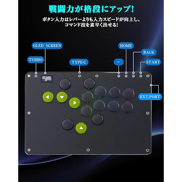 【T16 PROブラック レバーレスコントローラーが新登場!】 薄型で天板広め。一般的なアーケード筐体よりも押し心地が優れている、真っ黒ボディがとてもかっこよくて、ボタンは静音強め、滑り心地が絶秒!レバーよりも入力スピードが向上し、コマンド技を素早く出せるため、戦闘力も格段にアップ!つまり、ファイティングスティックより、レバーレス アケコンの最大の利点は、方向キーによる遅延やレスポンス度合いはこちらの方が圧倒的な優位に感じられます。
