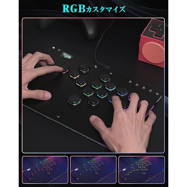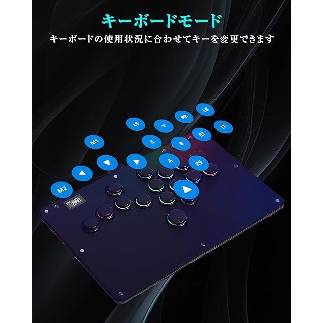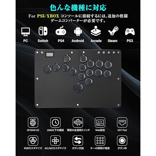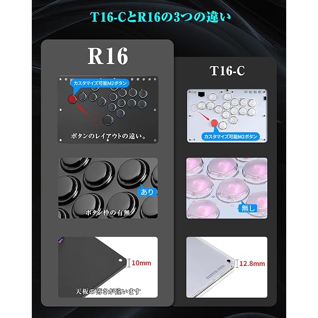 【格ゲー向けのレバーレスアケコンR16ブラック】 市販品と比べてボタンのレイアウトが変わった。業界でも珍しくM2ボタンが左の小指に移動、小指に慣れている方には、M2ボタンの機能を自分好みにカスタマイズ可能、超便利。ボタン枠の追加でしっかりした感触、操作性が向上しボタンが引っかからず外れにくくなり、適度なサイズで運指がしやすい。 Kailh製の高透明ロープロファイルスイッチを採用し、操作感が勿論、LEDライトも明るくて、視覚的にも楽しめます。天板広め、極薄の厚さ、手頃な本体サイズを備え、膝置き、机置き両方でも安定、持ち運びにも超便利。