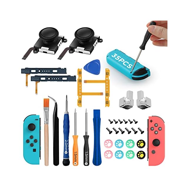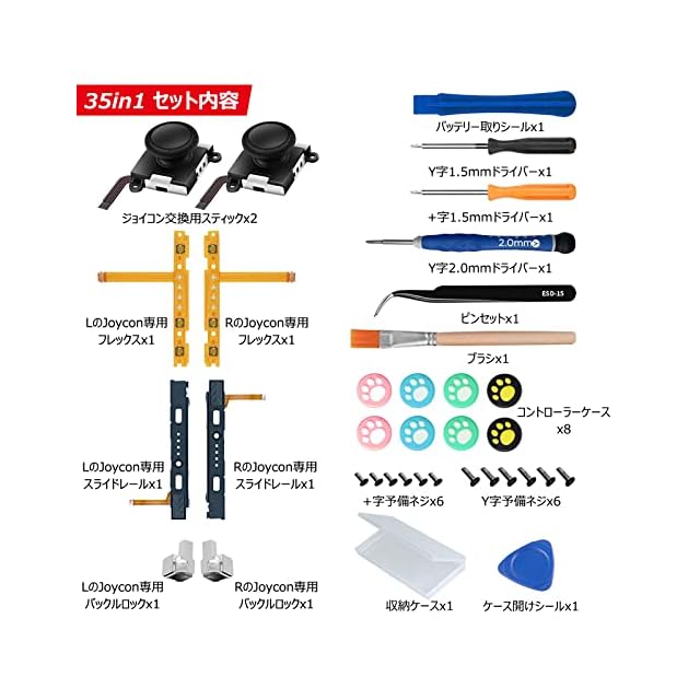 GeeRic 【35in1 ジョイコン修理セット】 Switch 修理キット Switch Joy-con 対応 コントローラー 修理セット スイッチ ジョイコン スティック 交換パーツ2個 SR SL キーボタン フレックスケーブル 左右セット2個 ライトケーブル2個 バックルロック2個 | つむぎ屋