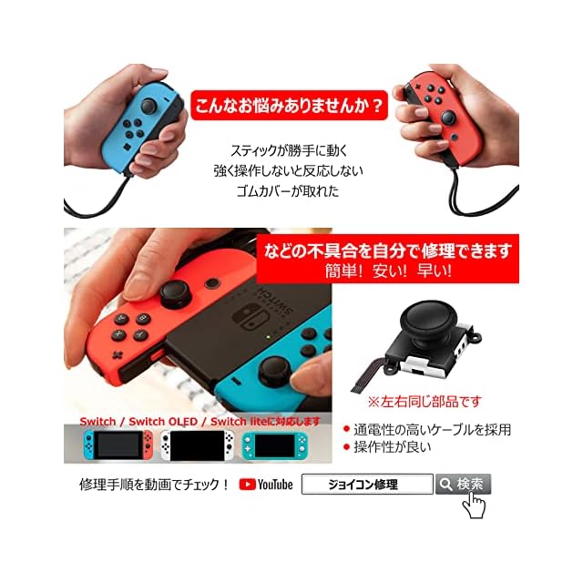 【switchスティックを安く簡単に修理♪~】「スティックが勝手に動く」「反応ガ悪くなってきた」「ゴムカバーが取れた」などのスティックの不具合を自分で修理できます。本交換用スティックは通電性の高いケーブルを採用し、操作性が良いです。(左右通用)
