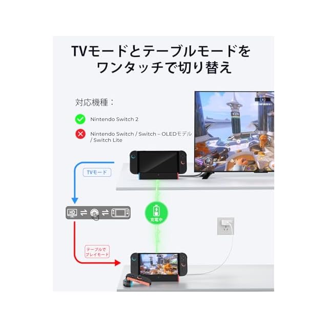 【ワンタッチで表示モード切替】背面のボタンを押すだけで、TV出力モードとテーブルモードを簡単に切り替え可能。8K、4K@120Hz、1080Pの映像出力に対応(Switch 2は最大4K@60Hz対応)。