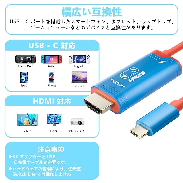 高性能:この USB-C to HDMI ケーブルは、Nintendo Switch 2 では 4K 高解像度と 60Hz 高リフレッシュレートに対応します。ゲーム体験を最大限に引き出します。補足:Steam Deck を含む各機種では最大 4K の出力解像度を実現できます。