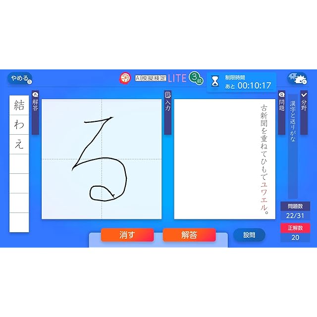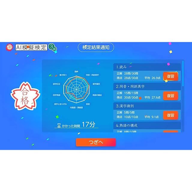 AIが生成するオリジナル模擬検定試験を収録!受検結果は漢検の合格者平均と比較可能。
