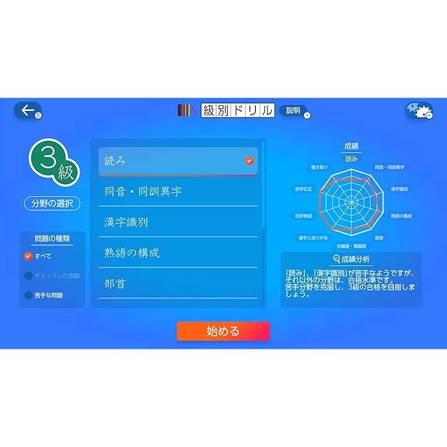 級別ドリルでは「チェックした問題」や「苦手な問題」などが呼び出せる充実の学習サポート機能搭載!弱点克服もバッチリ!