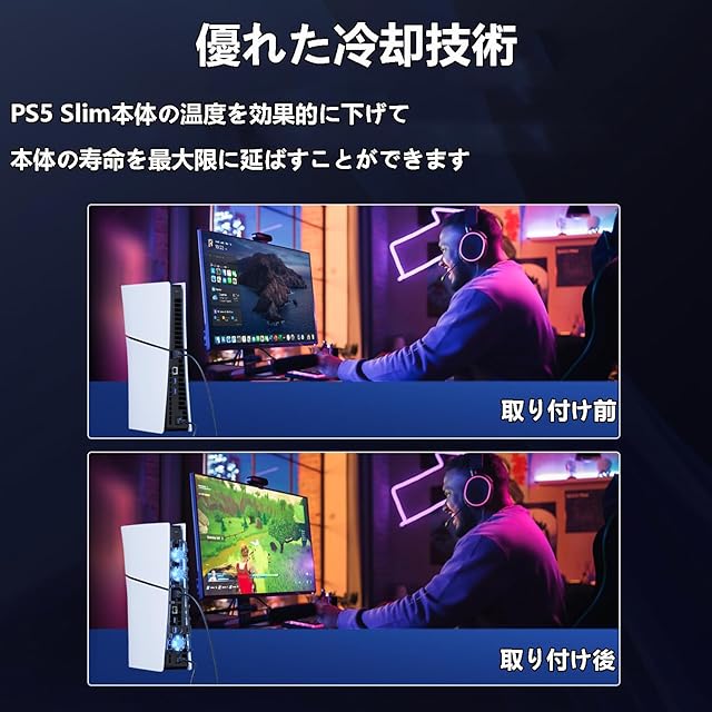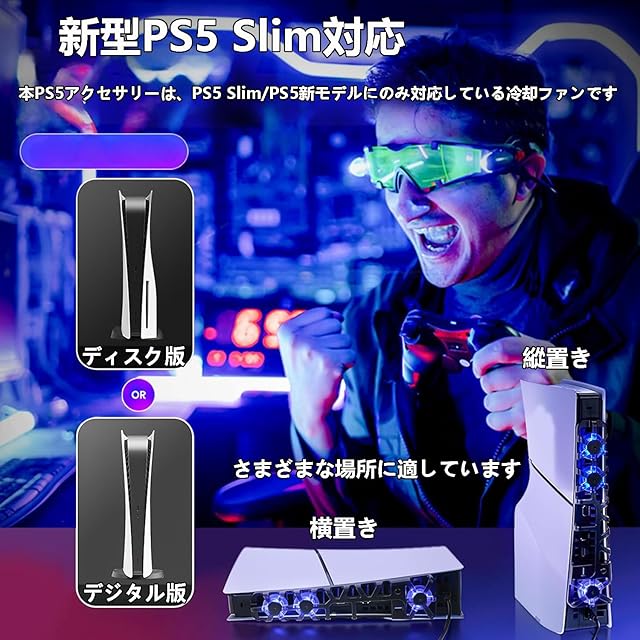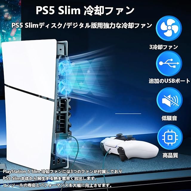 【新型PS5 Slim 冷却ファン】新型PS5 Slim対応。PlayStation 5 Slim 冷却ファンには3つのファンが付属しており、PS5 Slim本体から発生する熱を素早く放出します。コンソールの寿命とパフォーマンスを大幅に向上させます。注:旧型PS5とは互換性がありません。