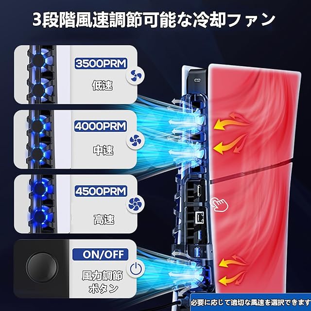 【効率的な冷却システム】爆熱の本体を冷やすのに適したクーリングファン付き。ファンの強弱3段階は本体のUSBポート横の切り替えスイッチで変更可能です。ファンの音は多少しますが、ゲームをしていれば気にならない程度です。長時間プレイも安心でき、ゲーム機の耐用年数を延ばすのに役立ちます。