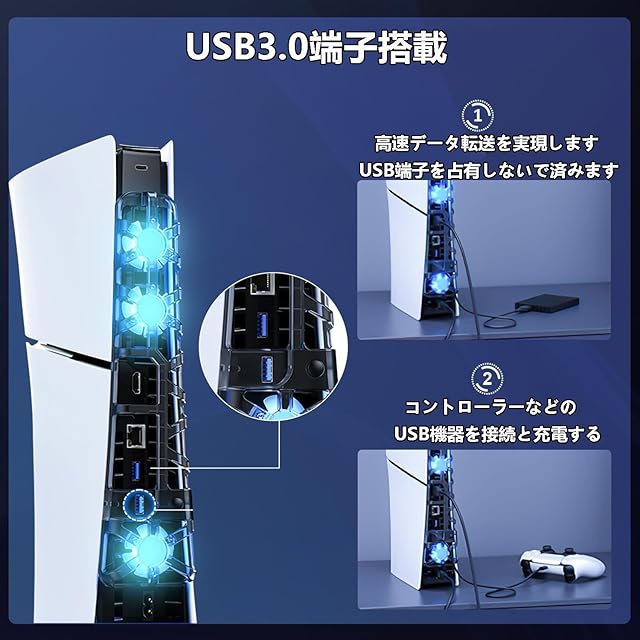 【USBパススルーポート】ファンのケースに内蔵されたUSBポートにより、ファンが接続されたUSBポートを他のデバイスに引き続き使用できます。USB 3.0端子搭載しており、高速データ転送を実現します。新型PS5 ファンを使用してもUSBポートの数を減らすことなく、充電やコントローラの有線接続などにお使いいただけます。