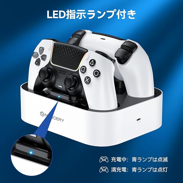 【LEDランプ・滑り止めマット】コントローラーが充電されると、LEDランプは青色に点滅し、コントローラーの充電が終了するとLEDランプは点灯します。PS5充電器には4つの滑り止めマットがあり、摩擦力を増やし、滑りを防ぐことができます。