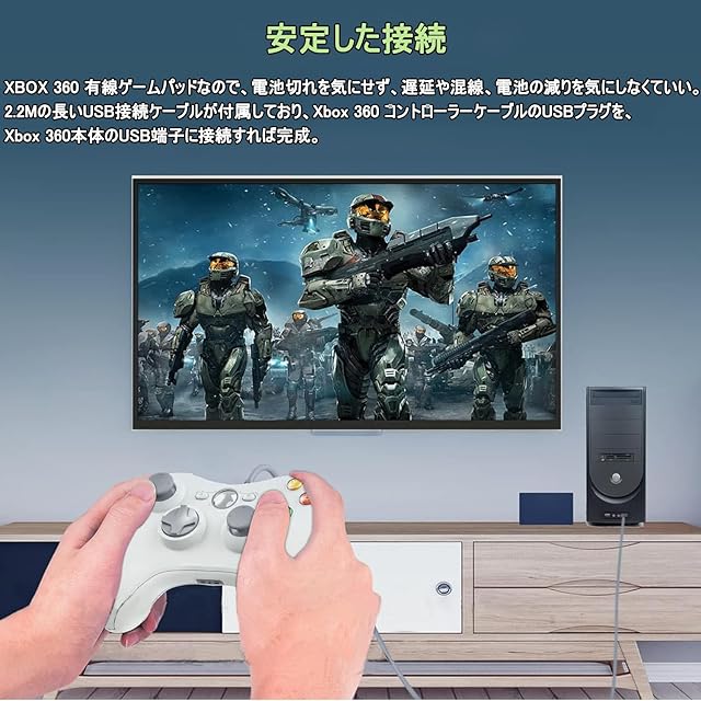 【安定した接続】XBOX 360 有線ゲームパッドなので、電池切れを気にせず、遅延や混線、電池の減りを気にしなくていい。Xbox 360 用コントローラーケーブルのUSBプラグを、 Xbox 360本体のUSB端子に接続すれば完成。コントローラーアップグレード必要ありません。 2.2Mの長いUSB接続ケーブルが付属しており、USBポートがコンピュータに接続されるとすぐにゲームを開始できます。安定された有線接続と強力な信号伝送で、無線コントローラの電池切れ・スリープモードの、煩わしさ・突然のBluetooth接続不良などのトラブルから貴方を開放し、快適なゲーム環境をご提供いたします!