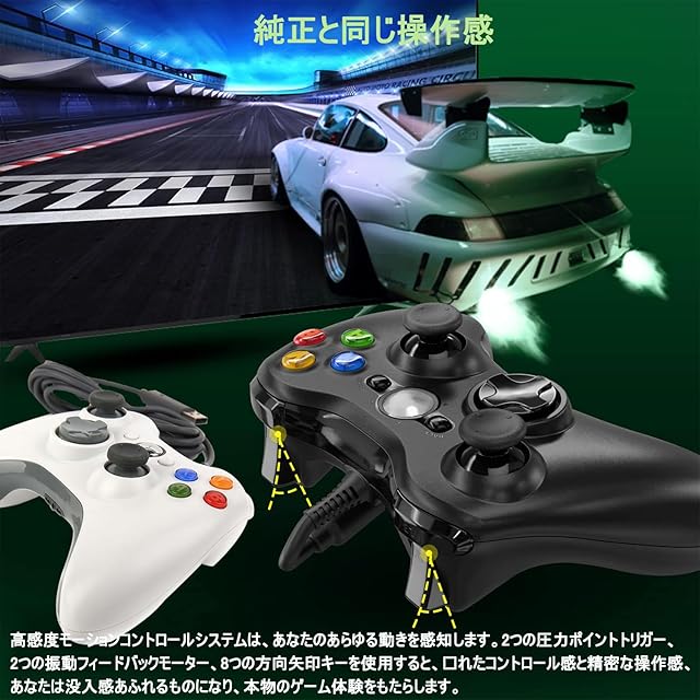 【純正と同じ操作感】Xbox 360有線コントローラー pc、高感度モーションコントロールシステムは、あなたのあらゆる動きを感知します。2つの圧力ポイントトリガー、2つの振動フィードバックモーター、8つの方向矢印キーを使用すると、优れたコントロール感と精密な操作感、あなたは没入感あふれるものになり、本物のゲーム体験をもたらします。ダブルバイブレーションのデザインと各アクションがゲームに表示されます。優れたABS素材を採用したので、高耐久のボタンはとても壊れにくいです。さらに、すべてのボタンが即座に反応するため、素晴らしい触覚フィードバックがされ、最大限の快適なゲーム体験が得られます。