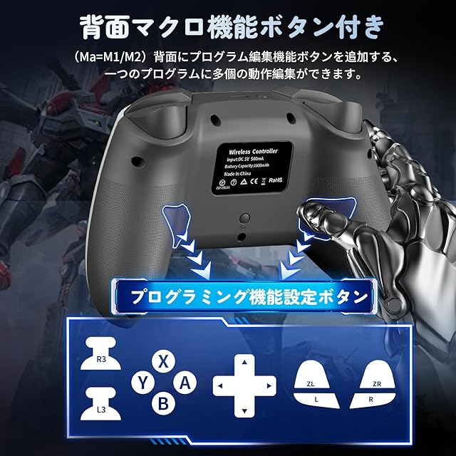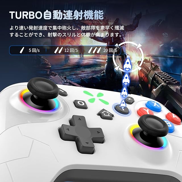 【TURBO自動連射&マクロ機能搭載】本コントローラーにはTURBO連射機能付き、3段階の連射スピードが調節できます、ゲームによって連射スピードを毎秒5回/12回/20回調節できます、TURBO連射機能は自由に設定できます、格闘系ゲームなら、是非この連射機能を利用すれば、勝率をアップさせましょう!また、switch コントローラーの背部に2つのマクロボタン(Ma=M1、M2)があり、一つのプログラムに多個の動作編集ができます。アクションゲーム、ミニゲームなどの様々なゲームに必須の技「コンボ技」をこのコントローラーならストレスフリーで楽に放つことができます、操作効率が2倍になり、初心者でも新境地を打ち出すことができ、ゲーム全体を簡単に楽しむことができます。