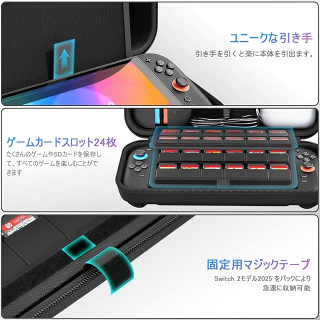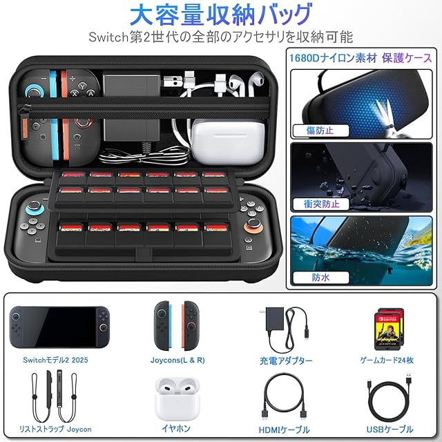 【大容量・抜群な収納力】Switch 2本体だけではなく、ドック、Joy-Con、Joy-Conストラップ、Joy-Conグリップ、充電ケーブル 、イヤホンと他の小物類をまとめて収納できます。ゲームカードも最大24枚収納可能です。 旅行先や出張先に活躍します。