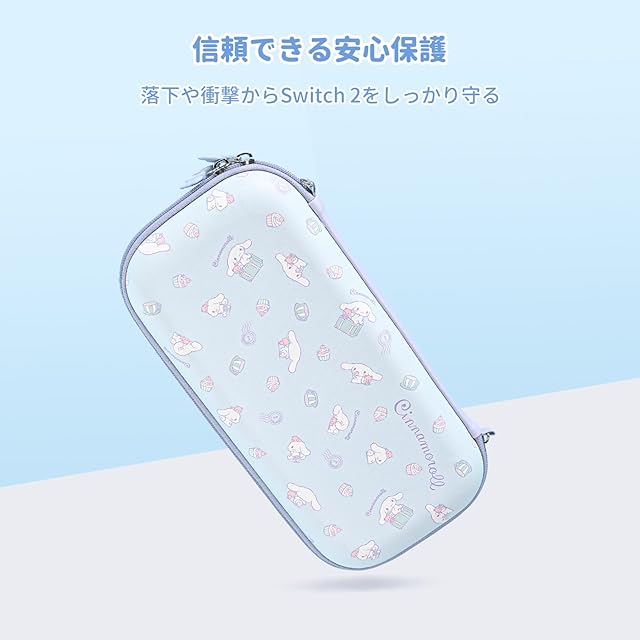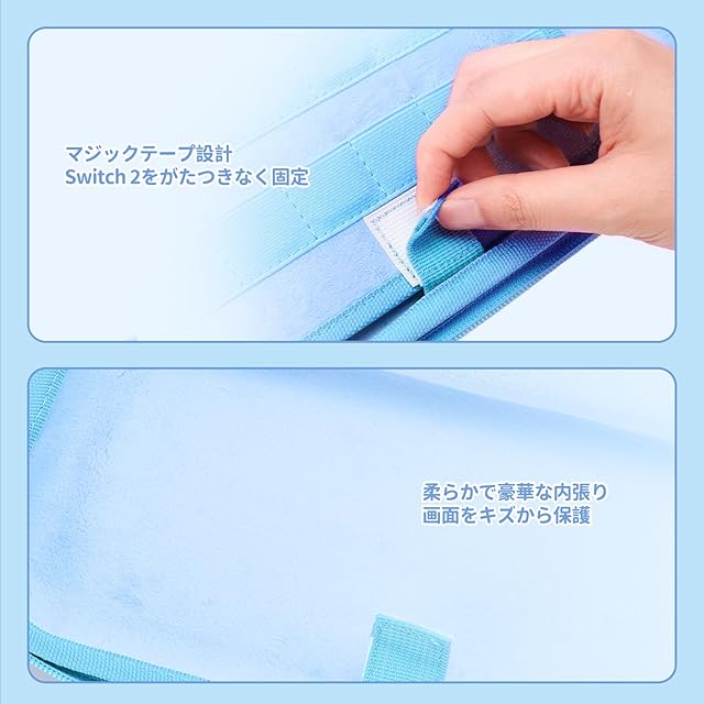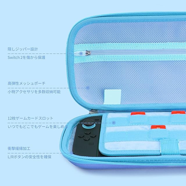 「しっかり保護」:内側に収納用ポケットを備えたケースで、外側は厚みがあり、高い安心感を提供します。内側には柔らかなクッション素材を使用しており、Switch2をしっかりと固定し、落下によるダメージを防ぎます。