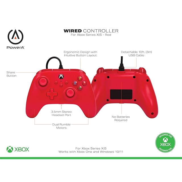 【Xbox公式ライセンス商品】PowerA 有線コントローラー Xbox Series X|S Xbox One PC Windows 10/11 用(公式ライセンス取得) 1519366-01 レッド 二重振動機能 | つむぎ屋