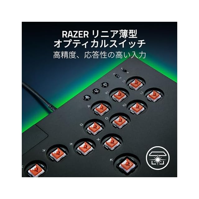 【Razer リニア薄型オプティカルスイッチ】アクチュエーション距離を短くして応答性を向上させた高速スイッチを搭載しており、正確に技を出すための必要なスピードと精度を備えています。