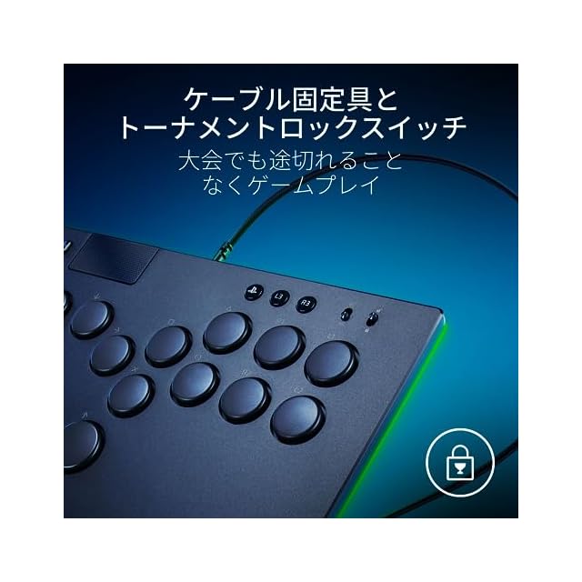 【ケーブル固定具とトーナメントロックスイッチ】ケーブルを固定する内蔵ロックと不要なボタンを無効にするロックスイッチにより、誤って入力したり、ケーブルが外れたりすることがなく、白熱したゲームでも集中してプレイできます。