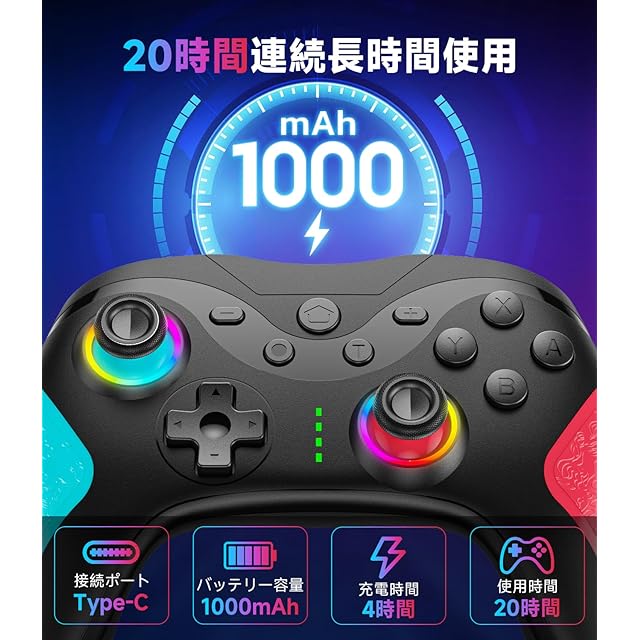 【長時間安心使用&人間工学デザイン】Switchコントローラー には1000mAhの大容量バッテリーが内蔵されており、急速充電で4時間、16~20時間の連続使用が可能です。 Switch でバッテリー残量を確認できるだけでなく、コントローラー自体にも電圧低下警告機能が搭載されている。 バッテリー残量が少なくなると、ゲームパッドのインジケーターランプが点滅する。switch コントローラー 連射人間工学に基づいたデザインで、質感のあるグリップが指にフィットします。フェイクレザーを採用し、手の構造に合わせて流線型で心地よい感触を生み出します。ゲームパッドの両端には滑り止め加工を施し、手汗による滑りを防止する設計。 長時間のゲームプレイでも疲れさせません。