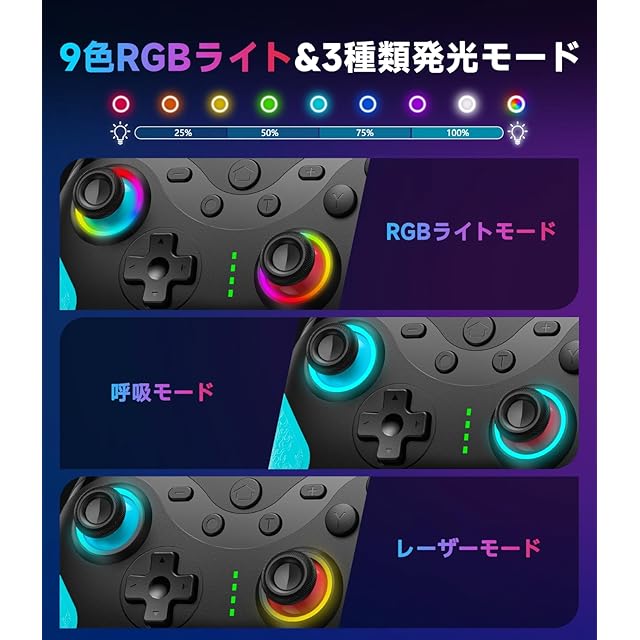 【多機能Switchコントローラー Pro】革新版スイッチ コントローラーはAndroid/IOS(IOS16.0 以上)/Windows PCなどのSwitch/Switch Lite/Switch OLEDに対応。ワイヤレスBluetooth5.0通信技術を採用し、Switchホストとのスムーズな無線接続を実現することで、より自由なコントロールと安定した接続信号を提供します。10メートルの距離でもゼロ遅延で、高速フィードバック、瞬時の送信、100%の安定性をします。プロコントローラー switchには9色のRGBライトと3種類のライトモードが搭載されます。(呼吸モード/定常光モード/フラッシュモード)をお好みに合わせて自由に切り替えることができ、ゲームプレイ中の雰囲気を盛り上げます!