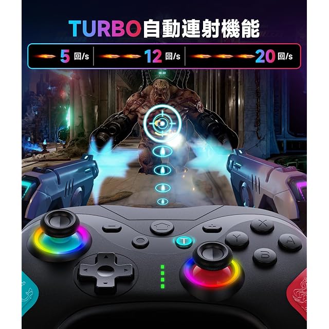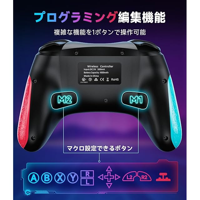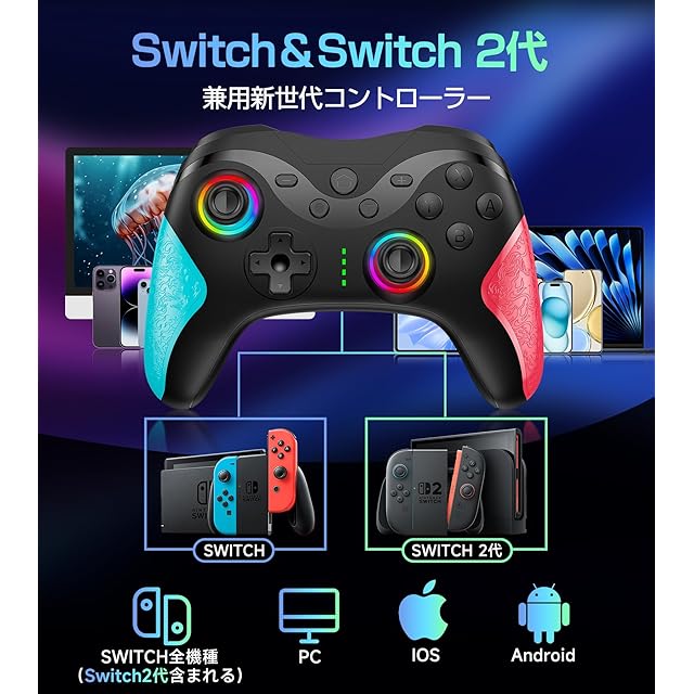 商品名:Switch コントローラー Switch1/2代対応 TURBO連射機能 マクロ機能 背面ボタン付き 9色RGBライト 1000mAh大容量 Bluetooth 無線接続 スイッチ コントローラー ジャイロセンサー搭載 4階段HD振動 スリープ解除 プロコン Switch/Lite/OLEDに対応 Android/IOS/PCにも対応 日本語取扱説明書付き