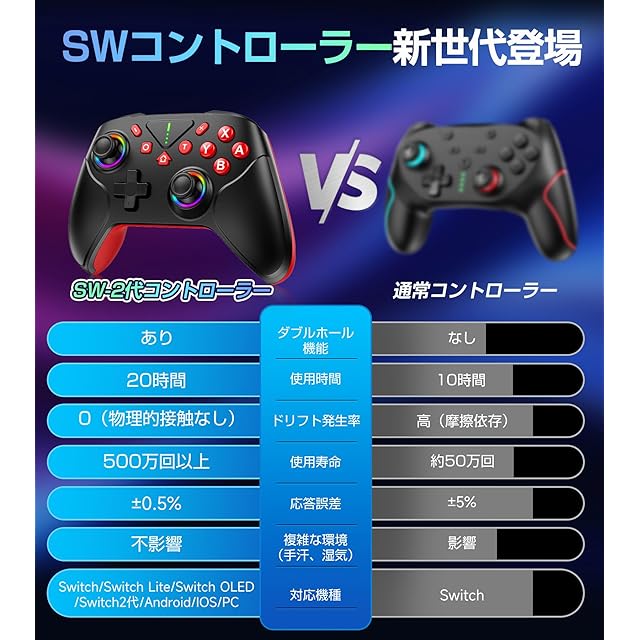 【2025革新モデルSwitchコントローラー Pro】革新版スイッチ コントローラーはSwitch1代/2代/Android/IOS16.0 以上/PCに幅広く対応。従来品の最大不満だった「スティックドリフト」を完全解決!★磁気ホールセンサー採用のダブルホール機能設計で物理摩耗を排除。→ 500万回動作テスト通過(耐久性10倍)、従来モデルと比較して長期間使用でも安定した精度を維持。★競技級精度:0.01mm微調整可能(誤差±0.3%未満)。日本ユーザー向けにABXYボタン配置を純正同様に最適化。お子様からプロゲーマーまで、すべてのプレイヤーにおすすめ。