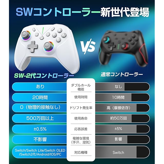 【2025革新モデルSwitchコントローラー Pro】革新版スイッチ コントローラーはSwitch1代/2代/Android/IOS16.0 以上/PCに幅広く対応。従来品の最大不満だった「スティックドリフト」を完全解決!★磁気ホールセンサー採用のダブルホール機能設計で物理摩耗を排除。→ 500万回動作テスト通過(耐久性10倍)、従来モデルと比較して長期間使用でも安定した精度を維持。★競技級精度:0.01mm微調整可能(誤差±0.3%未満)。日本ユーザー向けにABXYボタン配置を純正同様に最適化。お子様からプロゲーマーまで、すべてのプレイヤーにおすすめ。