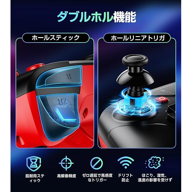 ✨「ダブルホール機能Switch コントローラーが誕生」悩ませるスティックのドリフト問題を解決!左右スティックとリアルトリガーにダブルホール機能を採用した次世代設計。磁気による非接触検出で物理的な磨耗をゼロに抑え、従来のポテンショメーター式に比べ10倍以上の寿命(500万回動作)を実現。0.01mm単位の微調整が可能な超高精度センサーにより、誤差±0.5%以下で実現。5msの超低遅延応答で入力信号を瞬時に反映、競技レベルの反応速度を確保。防塵防水仕様で汗や埃に強く、過酷な連打操作や長時間プレイに最適。