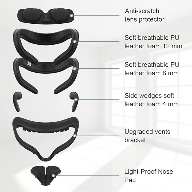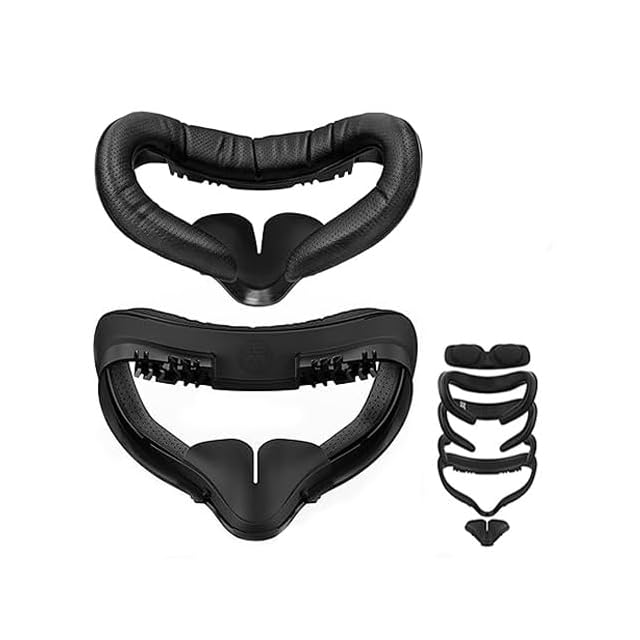 【パッケージ内容】オプションの厚さのVR フェイスカバー*2,VRフェイシャルインターフェイスブラケット*1,漏れ防止ノーズパッド*1,VRレンズカバー*1,PUフォーム交換パッド*2。