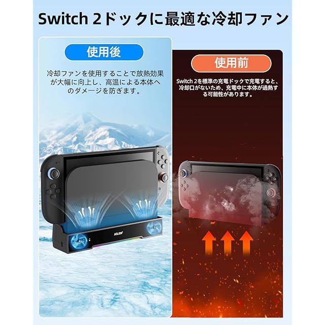 【優れた冷却性能でSwitch 2を守る】最新のSwitch 2は4K出力時に高温になりやすく、適切な冷却が不可欠です。本製品はSwitch 2専用に設計された冷却ファンで、冷却効率を大幅に向上。熱暴走によるフリーズや動作異常を防止し、本体寿命をしっかり延ばします。
