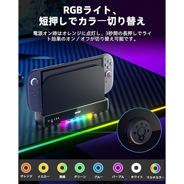 【RGBライティングでゲーミング気分アップ】switch2対応 冷却ファン RGBライト付きで、電源オン時はオレンジに点灯。ボタンを短く押すとカラー変更、3秒長押しでライトのON/OFFも可能。雰囲気を高める演出でデスク周りをスタイリッシュに。