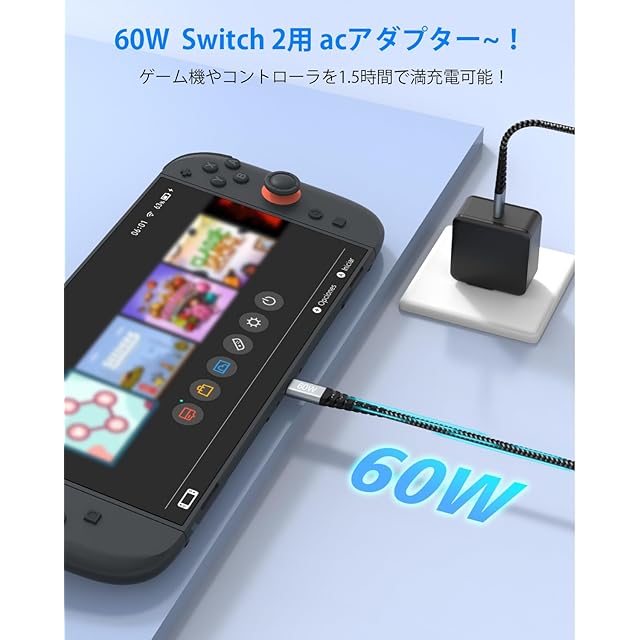 FFZZKJ Switch 2 用 acアダプター 60W PD対応 スイッチ 2 用 充電器 GaN採用 TVモード対応 折り畳み式プラグ Switch/Switch Lite/ドック/Switch OLED/Proコントローラー向けの スイッチ 2 交換用 acアダプター | つむぎ屋