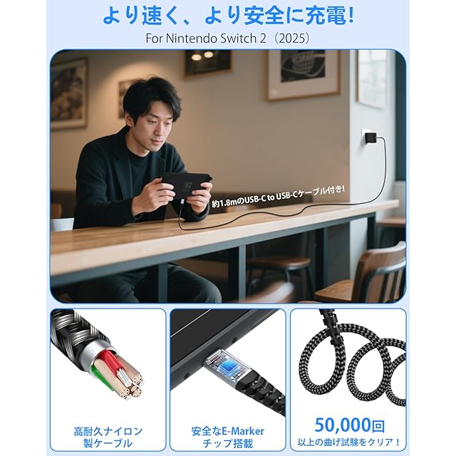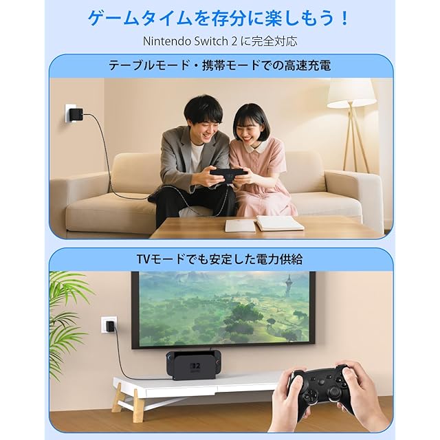 【ゲーム機やコントローラを急速充電】このスイッチ2と互換性のあるACアダプターは急速充電規格である「USB PD」を搭載し、最大60Wの急速充電で、本体を1時間で60%、約1.5時間で100%の充電を行えます。充電機能上は純正と変わりなくドックに接続してTV出力もできます 。ACアダプターとUSBケーブルは取り外し可能で、コンパクトに収納できます。