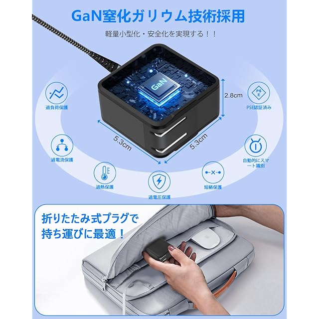 【小型化と高出力を両立】本製品は次世代パワー半導体素材GaN(窒化ガリウム)を採用し、重さ約100gと軽量。プラグを折りたたむことでさらにコンパクトに収納でき、ガジェットポーチやバッグにも収まりやすくなります。持ち運び用のポータブルゲーム機対応(例:Switch 2を含む)予備充電器を探している場合、プラグを折りたためる物がおすすめです。折りたたみ式は、持ち運び時に他のアイテムを傷つけにくいメリットもあります。USB-C対応のゲーム機やPC、スマートフォンなど幅広い機器に対応し、旅行や友人宅など外出先での使用にも最適な予備用アダプターです。